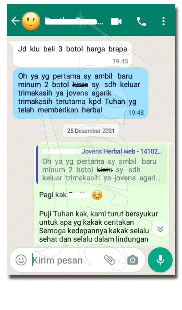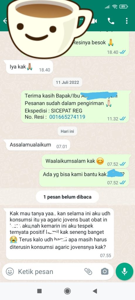 “Kak mau tanya yaa.. kan selama ini aku udh konsumsi itu ya agaric jovens, nah kemarin ini aku tespek ternyata positif Garis Dua kak seneng banget”